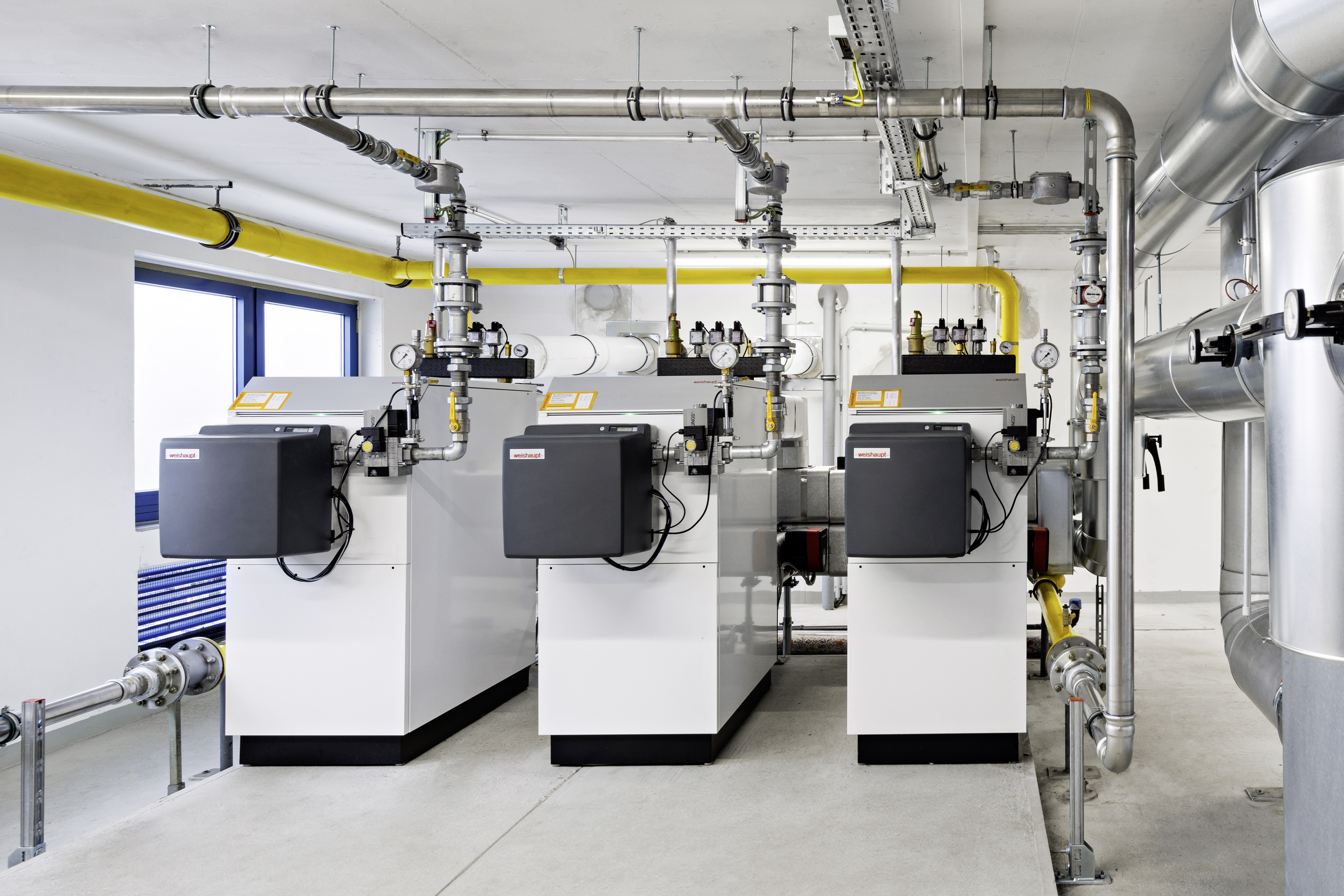 A fűtési rendszer korszerűsítésének részeként a Bauunternehmung Böpple GmbH három Weishaupt Thermo Condens® WTC-GB 620 gázüzemű kondenzációs kazánt telepített kaszkádkonfigurációban, valamint egy Weishaupt MKR vezérlőrendszert. Ez a vezérlőrendszer kezeli a hőtermelést és -elosztást, a kazánok kaszkádvezérlését, a térfogatáram szabályozását mind a termelési, mind a fogyasztási oldalon, valamint a vizualizációt. A hőmérsékletek, az üzemórák és az indítási számok adatrögzítése lehetővé teszi az üzemeltető számára, hogy bármikor figyelemmel kísérje a rendszer üzembiztonságát és hatékonyságát. Az új kondenzációs kazánoknak, a fordulatszám-szabályozott szivattyúknak és a termelési és fogyasztási oldalon egyaránt alkalmazott térfogatáram szabályozásának köszönhetően mind a villamosenergia- mind pedig a földgázfogyasztás jelentősen csökkent.
