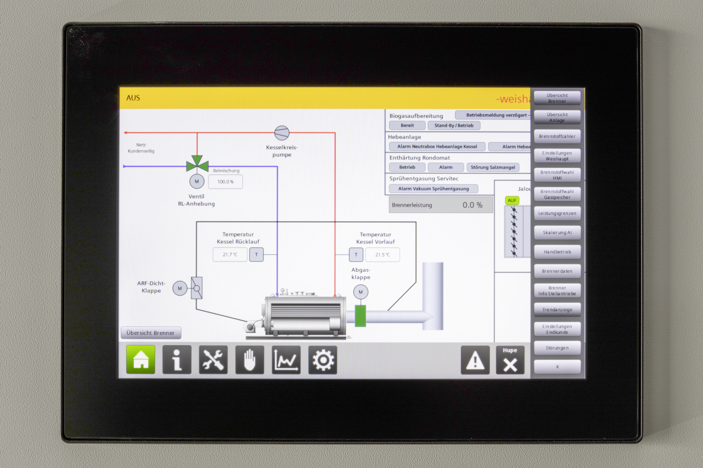 Ez a helyzet a bajorországi Rain am Lech-i Südzucker üzemben is. Ott egy újonnan épített kazánházban egy Weishaupt monarch® WM-G50 kétgázégő található, amely biogázt és földgázt használ tüzelőanyagként, akár egygázos, akár szimultán tüzelésű üzemben. Mivel a rendelkezésre álló biogáz mennyisége ingadozhat, a vezérlőrendszer zökkenőmentesen vált nyolc különböző tüzelőanyag arány között, változó biogáztartalommal, folyamatos üzem közben. A Weishaupt szabályzórendszere a W-FM 1000 égővezérléssel, és egy további PLC-vel, egy érintőpanelen keresztül nyomon követhetően menedzseli a biogáz felhasználást és a kazánvezérlést.