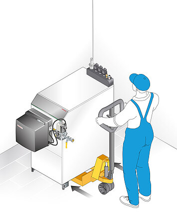 Az új kondenzációs kazán átgondolt technikája már a fűtőhelyiségbe történő beszállításnál, bevitelnél látható: a kazán alá bármelyik oldalról betolható a villás emelő, így a készülék szállítása, mozgatása rendkívül egyszerűvé vált.