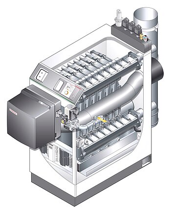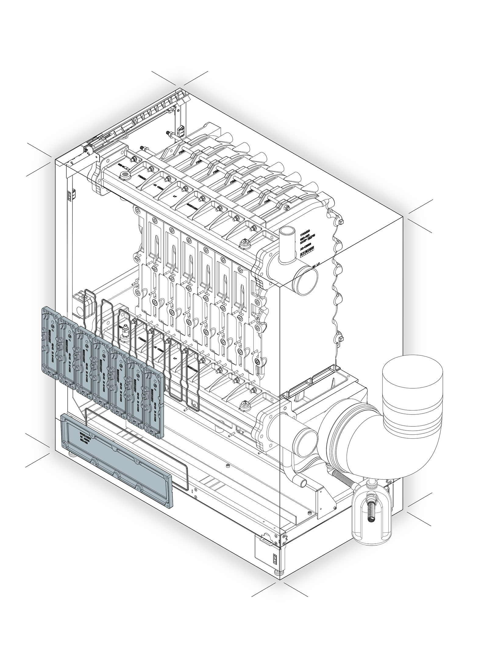 A kazántest optimalizált hidraulikai átáramlása gondoskodik arról, hogy minden kazántag egyenletes ellátást kapjon, valamint a légtelenítés hatékony legyen. A hőcserélőtest egyszerű és gyors karbantartását nagyméretű tisztítónyílások teszik lehetővé.