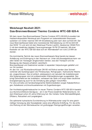 Ez az új kondenzációs kazán 60 kW-tól modulációs szabályzásban 620 kW-ig adja le hőteljesítményét (50/30 °C-nál), Weishaupt WG40 PLN U Premix LowNOx égővel és a sokszor bevált W-FM 25 tüzelésvezérlővel van felszerelve. Egy négy WTC-GB 620 kazánból álló kaszkádrendszer akár 2,5 MW hőigényt tud kielégíteni.
